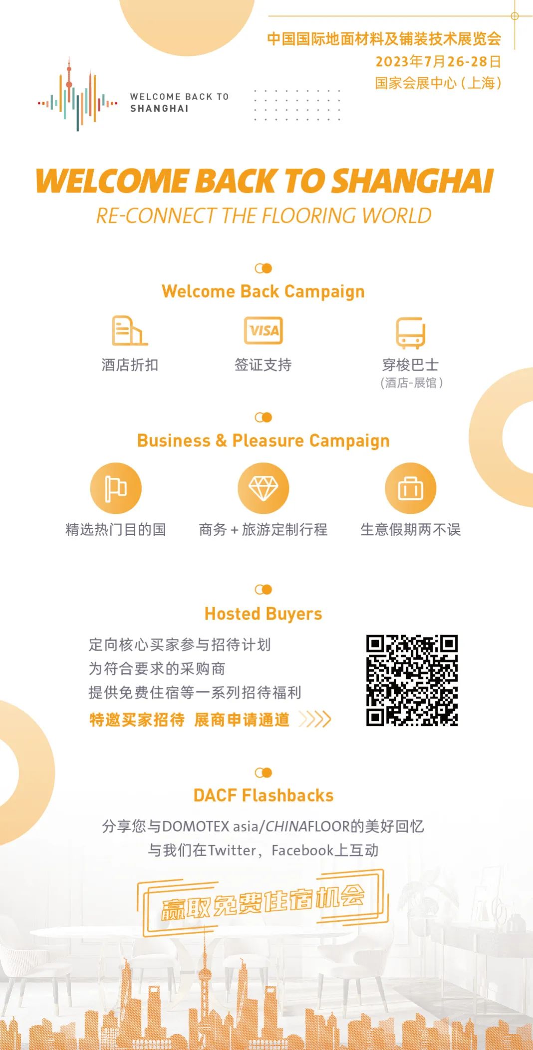 DOMOTEX asia 2023全新打造Welcome Back to Shanghai系列活动,邀请阔别三年的海外买家,通过特邀买家招待、定制化行程、便利签证支持等一系列服务,提升买家参观体验,减轻海外观众来华参观的后顾之忧。