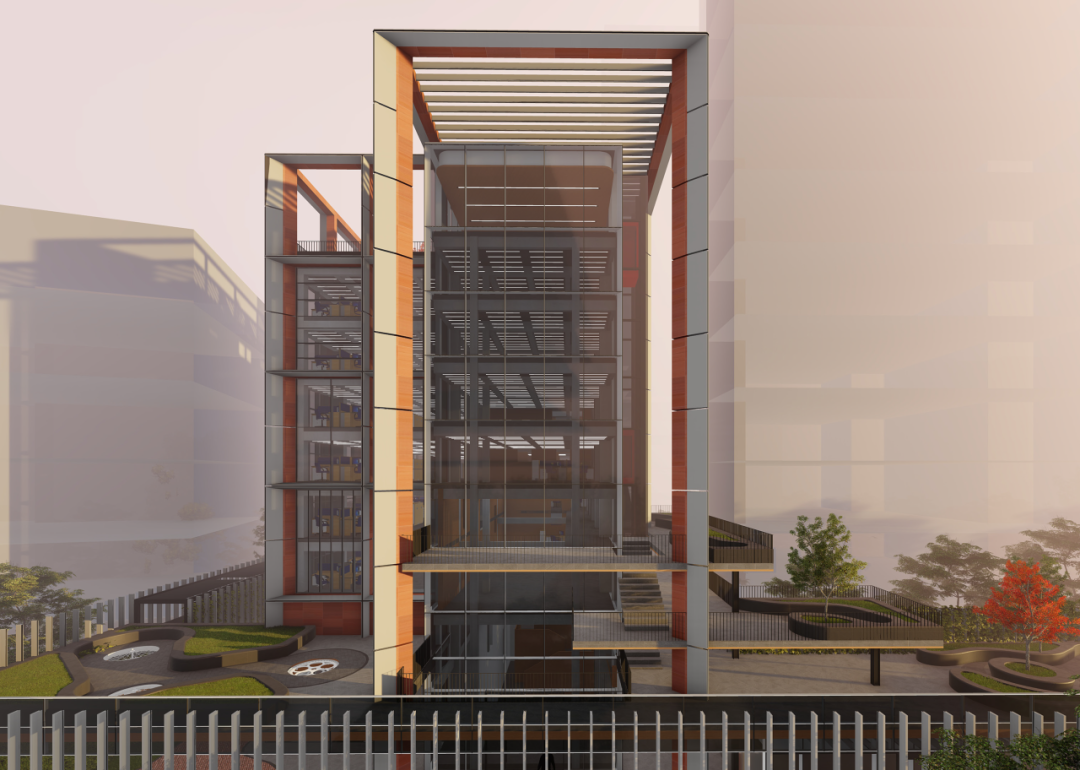 采用四叶草原型,体现世界性、生态性和标志性。设计采用以金属为主的材料作外饰,体现建筑的寓意和现代风格。除整体建筑端部外,其它各立面充分结合上层货运车道,设置具有结构作用的柱廊,考虑到该建筑体形的特点,在立面设计上强调竖线条,采用2.5m的竖向分格,弱化横线条,并起到遮阳作用。金属屋面板具有良好的隔音隔热、防漏抗冲击等功能,格栅的延伸则不仅强调了建筑的整体感,同时将其他建筑单体屋顶上所必需的大量机电通风等设备以透空百页形式遮蔽起来,巧妙地形成与整体有机的“第五立面”。