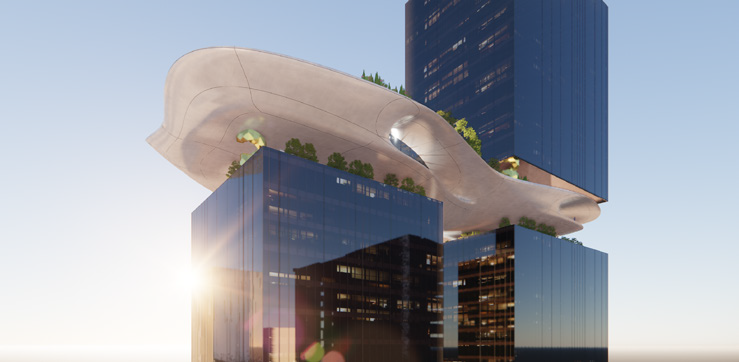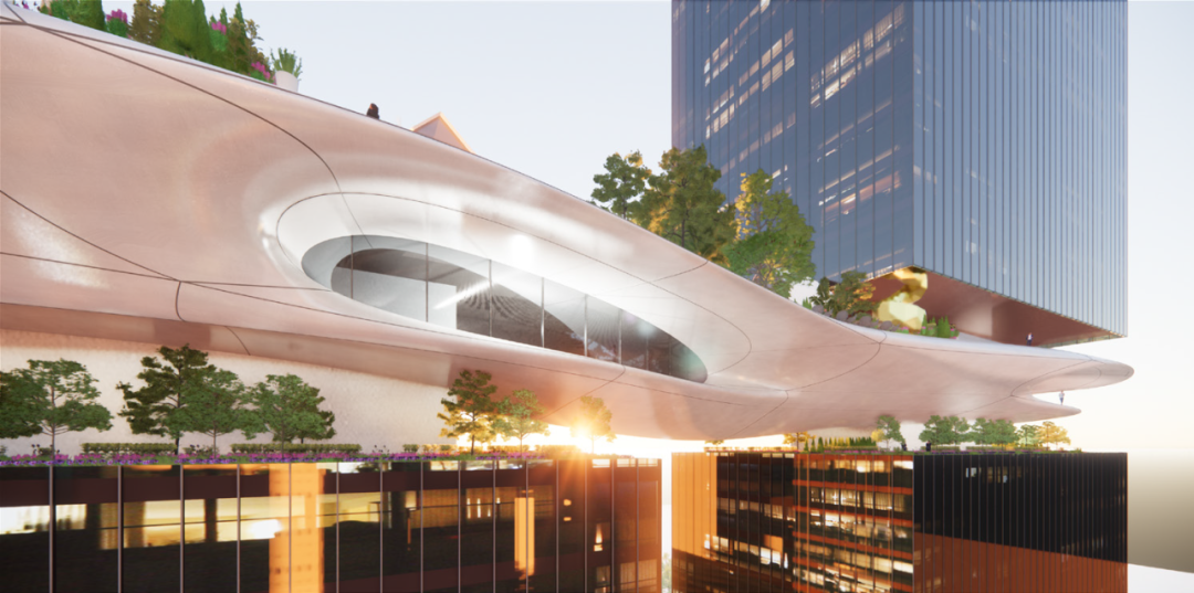 借助建筑高低错落的形体和多层次的室外平台,将丰富的水系,植被从各个维度引入,形成云山雾涧的城市绿洲奇观效果。美化环境,汇聚人流。