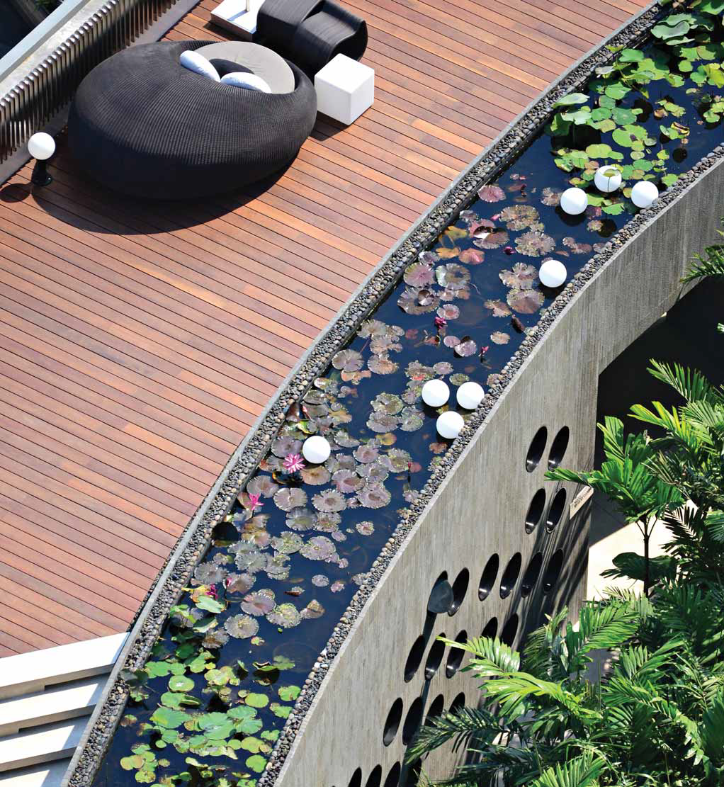 石板街形成一个连续的24小时全天候商业动线,将到访者从地面引至各层露台和屋顶花园。如同珍珠项链一般途经并串联起所有沿途设计亮点,为各项娱乐活动提供不间断的施展平台。从顶部云形天蓬处垂落的瀑布从最高点直接跌至在底部如裂缝一般的下沉庭院中,水池中飞溅的水花,迷雾,倒影,都令人仿佛置身幻境。耳听瀑布的落水声,身心在沁凉清爽的深呼吸后得到释放。