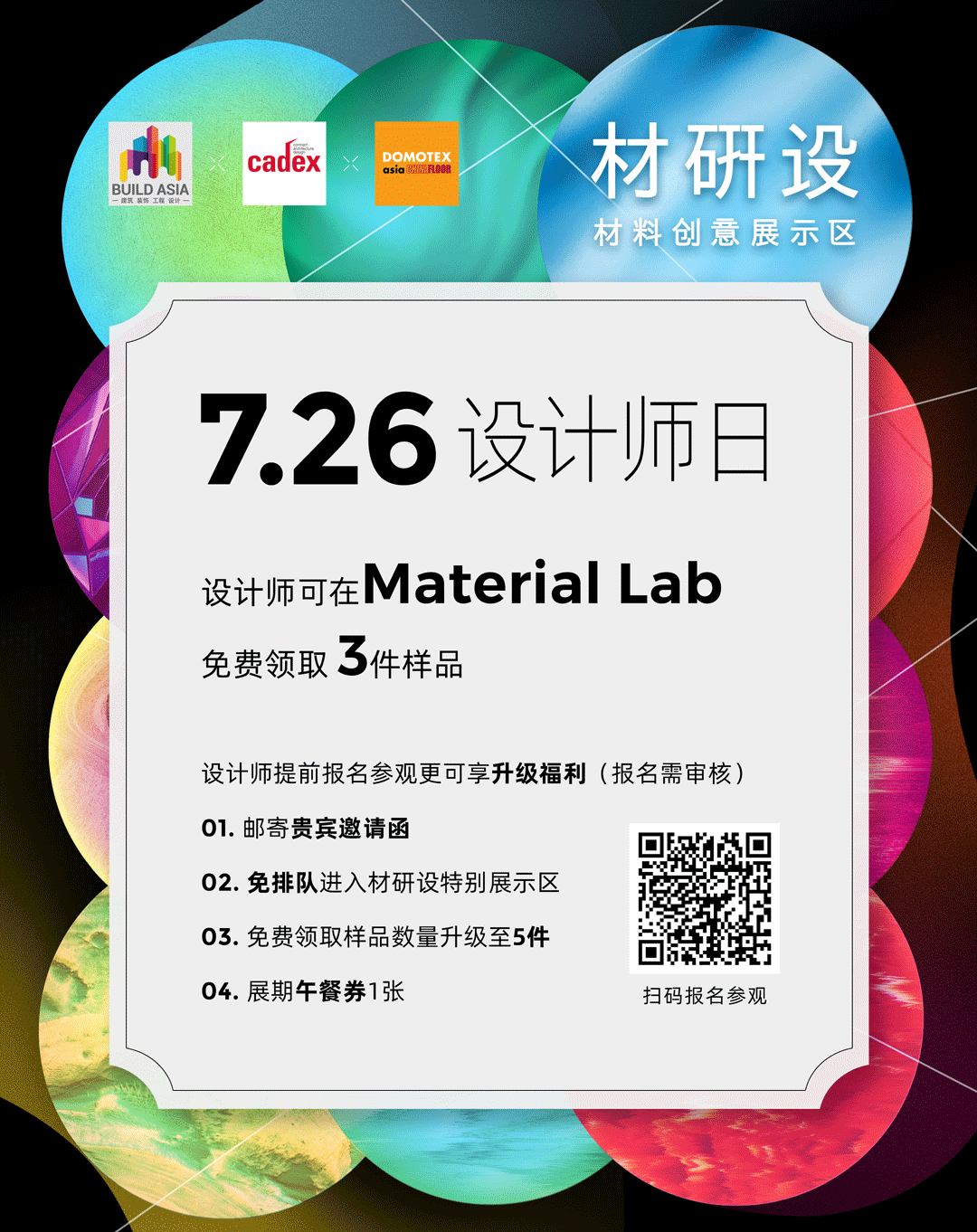 作为设计师专属的材料空间,材研设将7月26日展期第一天设为“设计师日”,特别展区将优先接待设计师观众,并仅向设计师派发材料样品(每人可领取3件样品),点击下方海报提前报名参观更可享升级福利(需审核)
