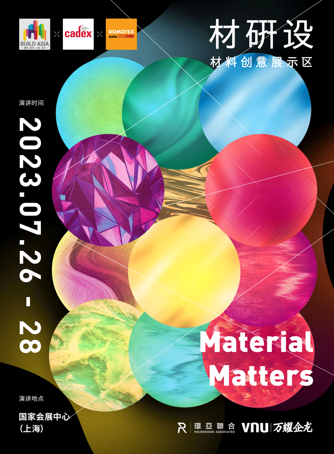 2023年,DOMOTEX asia携手专业建筑设计展cadex建筑纪元升级打造Material Matters材研设材料创意展示区,区域升级、设计升级、互动升级,甄选独具设计或技术含量的创新材料,通过设计师主题策展、样品体验、研讨会分享的形式,搭建材料商与设计师双向互通的渠道。(文末附设计师专属福利)